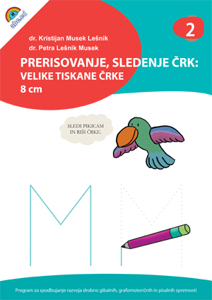 Naloge v tem delovnem zvezku so načrtovane tako, da otrok s sledenjem ali prerisovanjem 8 cm velikih tiskanih črk uri motorične dejavnosti, povezane s pisanjem, obenem pa se zaporedje gibov pri pisanju različnih črk utrjuje v motorični spomin. Naloge v delovnem zvezku zahtevajo bodisi sledenje narisanim črkam, bodisi prerisovanje črk. Pri sledenju se težavnost nalog postopoma povečuje z naraščajočim razmakom med pomožnimi pikicami.