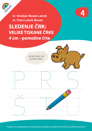 O sledenju in prerisovanju velikih tiskanih črk Sledenje je pomembna aktivnost pri spodbujanju koordinacije oko - roka. Ko otrok s svinčnikom ali drugim pisalom sledi narisani črki in sproti primerja svojo črko z osnovno predlogo, se krepi nadzor nad drobnimi gibi roke, s katerimi nadzira premikanje pisala in se utrjuje vizualno motorična integracija. Podobno velja za prerisovanje: med prerisovanjem otrok s pogledom sproti sledi napredujoči risbi in jo primerja z osnovno predlogo. Tudi pri teh vajah se utrjuje nadzor nad drobnimi gibi roke in krepi vizualno motorična integracija. Delovni listi in dejavnosti v tem delovnem zvezku Naloge v tem delovnem zvezku so načrtovane tako, da otrok s sledenjem ali prerisovanjem 4 cm velikih tiskanih črk uri motorične dejavnosti, povezane s pisanjem, obenem pa se zaporedje gibov pri pisanju različnih črk utrjuje v motorični spomin. Pri pisanju črk so otroku v pomoč pomožne črte. Naloge v delovnem zvezku se razlikujejo in zahtevajo bodisi sledenje narisanim črkam, bodisi prerisovanje črk v prazne vrstice.