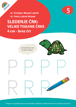 O sledenju in prerisovanju velikih tiskanih črk Sledenje je pomembna aktivnost pri spodbujanju koordinacije oko - roka. Ko otrok s svinčnikom ali drugim pisalom sledi narisani črki in sproti primerja svojo črko z osnovno predlogo, se krepi nadzor nad drobnimi gibi roke, s katerimi nadzira premikanje pisala in se utrjuje vizualno motorična integracija. Podobno velja za prerisovanje: med prerisovanjem otrok s pogledom sproti sledi napredujoči risbi in jo primerja z osnovno predlogo. Tudi pri teh vajah se utrjuje nadzor nad drobnimi gibi roke in krepi vizualno motorična integracija. Delovni listi in dejavnosti v tem delovnem zvezku Naloge v tem delovnem zvezku so načrtovane tako, da otrok s sledenjem ali prerisovanjem 4 cm velikih tiskanih črk uri motorične dejavnosti, povezane s pisanjem, obenem pa se zaporedje gibov pri pisanju različnih črk utrjuje v motorični spomin. Naloge v delovnem zvezku se razlikujejo in zahtevajo bodisi sledenje narisanim črkam, bodisi prerisovanje črk v prazne vrstice.