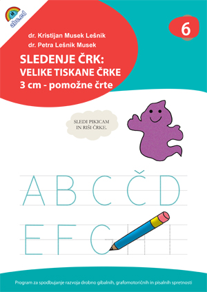 O sledenju in prerisovanju velikih tiskanih črk Sledenje je pomembna aktivnost pri spodbujanju koordinacije oko - roka. Ko otrok s svinčnikom ali drugim pisalom sledi narisani črki in sproti primerja svojo črko z osnovno predlogo, se krepi nadzor nad drobnimi gibi roke, s katerimi nadzira premikanje pisala in se utrjuje vizualno motorična integracija. Podobno velja za prerisovanje: med prerisovanjem otrok s pogledom sproti sledi napredujoči risbi in jo primerja z osnovno predlogo. Tudi pri teh vajah se utrjuje nadzor nad drobnimi gibi roke in krepi vizualno motorična integracija. Delovni listi in dejavnosti v tem delovnem zvezku Naloge v tem delovnem zvezku so načrtovane tako, da otrok s sledenjem ali prerisovanjem 3 cm velikih tiskanih črk uri motorične dejavnosti, povezane s pisanjem, obenem pa se zaporedje gibov pri pisanju različnih črk utrjuje v motorični spomin. Pri pisanju črk so otroku v pomoč pomožne črte. Naloge v delovnem zvezku se razlikujejo in zahtevajo bodisi sledenje narisanim črkam, bodisi prerisovanje črk v prazne vrstice.