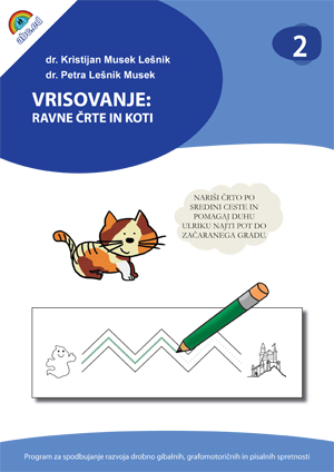 O vrisovanju Vrisovanje je pomembna dejavnost pri spodbujanju koordinacije oko - roka. Otrok riše črte znotraj prostora, ki ga omejujeta zunanji črti. Pri tem mora pozornost neprestano usmerjati na enakomerno oddaljenost narisane črte od obeh mejnih črt. Mejni črti predstavljata prostorsko omejitev, ki se ji mora otrok med risanjem prilagoditi. Ko pri risanju otrok s pogledom sledi napredujoči črti in jo primerja z mejnima črtama, se krepi vizualno motorična integracija in nadzor nad drobnimi gibi roke s katerimi otrok nadzira premikanje pisala znotraj omejenega prostora. Med risanjem naj otrok ne spreminja položaja lista in naj ga ne obrača. Pazi naj, da se med risanjem ne dotakne mejnih črt. Če je le mogoče, naj poskusi risati črte v eni potezi, brez ustavljanja ali prestavljanja pisala. Delovni listi in dejavnosti v tem delovnem zvezku Naloge v delovnem zvezku so načrtovane tako, da spodbujajo otrokovo zmožnost risanja daljših ravnih črt in kotov. Pri vrisovanju so otroku v pomoč pikice, ki jim lahko sledi pri risanju. Težavnost nalog v delovnem zvezku se stopnjuje v dveh smereh: