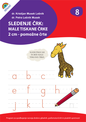 O sledenju in prerisovanju malih tiskanih črk Sledenje je pomembna aktivnost pri spodbujanju koordinacije oko - roka. Ko otrok s svinčnikom ali drugim pisalom sledi narisani črki in sproti primerja svojo črko z osnovno predlogo, se krepi nadzor nad drobnimi gibi roke, s katerimi nadzira premikanje pisala in se utrjuje vizualno motorična integracija. Podobno velja za prerisovanje: med prerisovanjem otrok s pogledom sproti sledi napredujoči risbi in jo primerja z osnovno predlogo. Tudi pri teh vajah se utrjuje nadzor nad drobnimi gibi roke in krepi vizualno motorična integracija. Delovni listi in dejavnosti v tem delovnem zvezku Naloge v tem delovnem zvezku so načrtovane tako, da otrok s sledenjem ali prerisovanjem 2 cm velikih malih tiskanih črk uri motorične dejavnosti, povezane s pisanjem, obenem pa se zaporedje gibov pri pisanju različnih črk utrjuje v motorični spomin. Pri pisanju črk so otroku v pomoč pomožne črte. Naloge v delovnem zvezku se razlikujejo in zahtevajo bodisi sledenje narisanim črkam, bodisi prerisovanje črk v prazne vrstice.