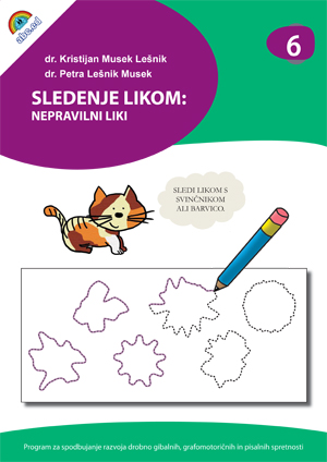 O sledenju Sledenje je pomembna aktivnost pri spodbujanju koordinacije oko - roka. Ko s svinčnikom ali drugim risalom sledi narisani predlogi, otrok s pogledom sproti primerja napredujočo risbo z osnovno predlogo. Pri tem se utrjuje nadzor nad drobnimi gibi roke s katerimi otrok nadzira gibanje pisala. Obenem se krepi tudi vizualno motorična integracija. Naloge sledenja so pomembne za pridobivanje spretnosti, ki igrajo pomembno vlogo pri razvoju pisanja, risanja in drugih drobno gibalnih spretnosti. Med risanjem oziroma sledenjem predlogam naj otrok ne spreminja položaja lista in naj predloge ne obrača. Če je le mogoče, naj poskusi risati posamezen lik v eni potezi, brez ustavljanja ali prestavljanja pisala. Delovni listi in dejavnosti v tem delovnem zvezku Naloge v tem delovnem zvezku so načrtovane tako, da otrok s sledenjem različno velikim likom utrjuje vizualno motorično integracijo in grafomotorične spretnosti. Predloženi liki so narisani z nizom pikic ali črtic, ki jim mora otrok slediti med risanjem. Težavnost nalog v delovnem zvezku se stopnjuje v več smereh: