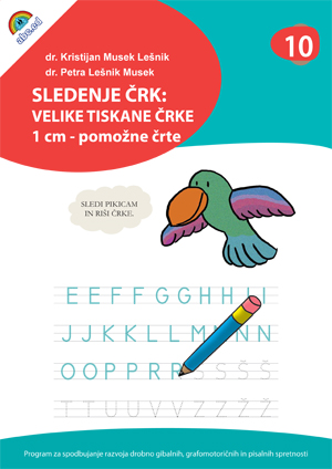 O sledenju in prerisovanju velikih tiskanih črk Sledenje je pomembna aktivnost pri spodbujanju koordinacije oko - roka. Ko otrok s svinčnikom ali drugim pisalom sledi narisani črki in sproti primerja svojo črko z osnovno predlogo, se krepi nadzor nad drobnimi gibi roke, s katerimi nadzira premikanje pisala in se utrjuje vizualno motorična integracija. Podobno velja za prerisovanje: med prerisovanjem otrok s pogledom sproti sledi napredujoči risbi in jo primerja z osnovno predlogo. Tudi pri teh vajah se utrjuje nadzor nad drobnimi gibi roke in krepi vizualno motorična integracija. Delovni listi in dejavnosti v tem delovnem zvezku Naloge v tem delovnem zvezku so načrtovane tako, da otrok s sledenjem ali prerisovanjem 1 cm velikih tiskanih črk uri motorične dejavnosti, povezane s pisanjem, obenem pa se zaporedje gibov pri pisanju različnih črk utrjuje v motorični spomin. Pri pisanju črk so otroku v pomoč pomožne črte. Naloge v delovnem zvezku se razlikujejo in zahtevajo bodisi sledenje narisanim črkam, bodisi prerisovanje črk v prazne vrstice.