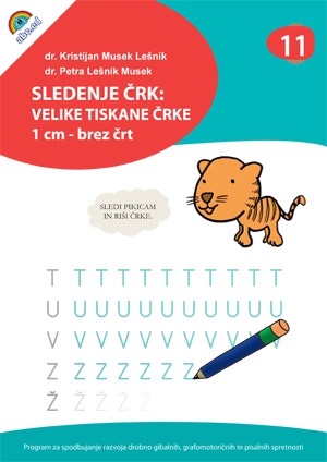 Naloge v tem delovnem zvezku so načrtovane tako, da otrok s sledenjem ali prerisovanjem 1 cm velikih tiskanih črk uri motorične dejavnosti, povezane s pisanjem, obenem pa se zaporedje gibov pri pisanju različnih črk utrjuje v motorični spomin. Naloge v delovnem zvezku se razlikujejo in zahtevajo bodisi sledenje narisanim črkam, bodisi prerisovanje črk v prazne vrstice.