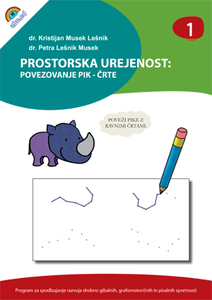 O povezovanju pik Povezovanje pik je pomembna dejavnost pri spodbujanju koordinacije oko - roka, pri kateri otrok riše ravne črte od ene do druge pike v nizu. Ko med risanjem otrok s pogledom sproti sledi napredujoči črti in njeno smer primerja s ciljno piko, se krepi vizualno motorična integracija in nadzor nad drobnimi gibi roke, s katerimi otrok nadzira premikanje pisala od pike do pike. Povezovanje pik je pomembno za utrjevanje prostorskih pojmov, ki igrajo pomembno vlogo pri razvoju pisanja, risanja in drugih grafomotoričnih ter drobno gibalnih spretnosti. Naloge, pri katerih otrok med risanjem išče najkrajše razdalje med posameznimi pikami, krepijo vidno razlikovanje (vizualno diskriminacijo), spreminjajoča smer risanja črt pa prispeva k razvoju zaznavanja drobnih gibov in kinestetičnega zavedanja. Med risanjem naj otrok ne spreminja položaja lista in naj ga ne obrača. Če je le mogoče, naj poskusi risati posamezen lik v eni potezi, brez ustavljanja ali prestavljanja pisala. Delovni listi in dejavnosti v tem delovnem zvezku Delovni listi v delovnem zvezku od otroka zahtevajo, da poveže niz pik, ki ležijo znotraj omejenega prostora. Naloge si sledijo od preprostih proti težavnejšim, težavnost se stopnjuje na tri načine: