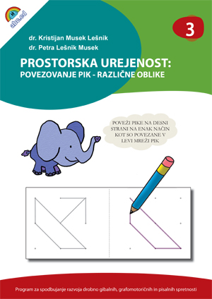 O povezovanju pik v like Povezovanje pik v like je pomembna aktivnost pri spodbujanju koordinacije oko - roka, pri kateri otrok prerisuje različno zapletene vzorce v mreži pik. Ko med risanjem otrok s pogledom sproti sledi napredujoči črti in njeno smer primerja s ciljno piko, se krepi vizualno motorična integracija in nadzor nad drobnimi gibi roke, s katerimi otrok nadzira premikanje pisala od pike do pike. Povezovanje pik v mreži je pomembno za utrjevanje prostorskih pojmov (dolžina in smer), ki igrajo pomembno vlogo pri razvoju pisanja, risanja in drugih grafomotoričnih ter drobno gibalnih spretnosti. Naloge, pri katerih otrok v mreži pik preriše predloženi vzorec, krepijo vidno razlikovanje (vizualno diskriminacijo), spreminjajoča se smer risanja črt pa prispeva k razvoju zaznavanja drobnih gibov in kinestetičnega zavedanja. Med risanjem naj otrok ne spreminja položaja lista in naj ga ne obrača. Če je le mogoče, naj poskusi risati posamezen vzorec v eni potezi, brez ustavljanja ali prestavljanja pisala. Delovni listi in dejavnosti v tem delovnem zvezku Delovni listi v delovnem zvezku od otroka zahtevajo, da poveže niz pik znotraj zarisane mreže v predloženi vzorec. Naloge si sledijo od preprostih proti težavnejšim.