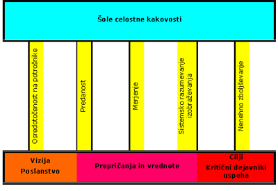 Model šol celostne kakovosti ponazarja kakovost vzgojnoizobraževalne organizacije kot zgradbo, ki stoji na omenjenih petih stebrih, ki rastejo iz temeljnih prepričanj in vrednot. Če je le eden od teh stebrov majav, je majava celotna zgradba.